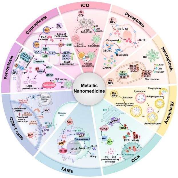 From the efficacy of cinnabar (mercury sulfide) in calming the mind and alleviating anxiety as described in the Divine Farmer's Classic of Materia Medica, to the use of arsenic trioxide (arsenic trioxide) for treating masses and accumulations in the Compendium of Materia Medica, and the modern clinical applications of arsenic trioxide and cisplatin, the concepts and wisdom of metal-based therapies in traditional Chinese medicine are undergoing a rebirth from empirical practices to scientific forms. In recent years, the pivotal role of metallic elements in regulating antitumor immune processes has gained recognition. For instance: manganese, as an immunological adjuvant, activates the cGAS-STING signaling pathway to transform the tumor microenvironment from “cold” to ‘hot’; elements like iron and copper induce novel cancer cell death mechanisms—ferroptosis or cupric-mediated death—signaling to the immune system to “eat me.” When combined with nanotechnology, the physicochemical properties of metal elements can be further optimized, enabling precise spatiotemporal regulation of in vivo delivery and release behavior to enhance drugability. Several metal nanomedicines with immunotherapeutic potential have now entered various stages of clinical trials.