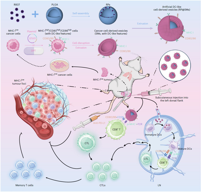 Addressing this critical scientific issue, Professor Kong Lingyi's team leveraged their systematic research in tumor vesicles (including exosomes and artificial vesicles) over recent years (Journal of Controlled Release, 2025; Molecular Cancer, 2024; Acta Pharmaceutica Sinica B, 2024; Pharmacological Research, 2024), proposed a novel technical approach: directly reprogramming autologous tumor cells obtained from surgical resection into antigen-presenting DC-like cells, thereby constructing personalized vaccine carriers from the source. The study revealed that STX11, a key molecule lowly expressed in tumor cells but highly expressed in immune cells (especially DCs), significantly upregulates MHC I and co-stimulatory molecules CD80/CD86 on the tumor cell membrane. By inducing STX11 overexpression, the team successfully obtained MHC I-high/CD80-high/CD86-high DC-like tumor cells and utilized their membranes to construct artificial DC-derived vesicular vaccines. This strategy preserves the patient-specific tumor antigen repertoire while introducing explicit immune co-stimulatory signals, enabling antigen-restricted CD8+ T cell activation. It demonstrated significant antitumor efficacy across multiple postoperative metastasis models (Figure 1).
